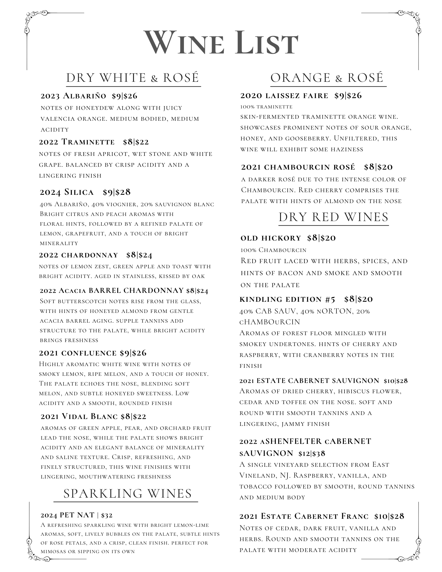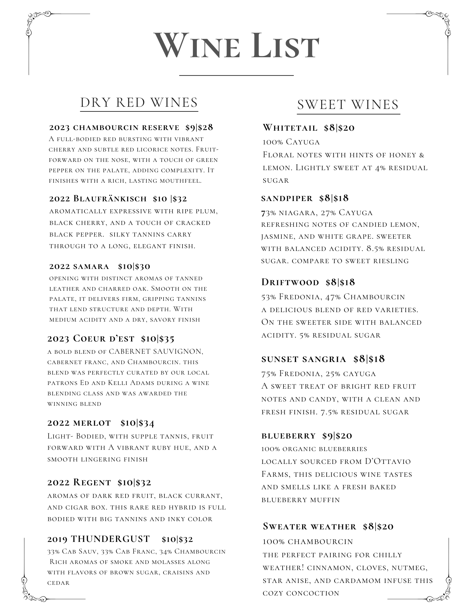 Wine list menu featuring categories for Whites & Rosé, Special Edition, and Reserve Reds, with wine names and prices listed.