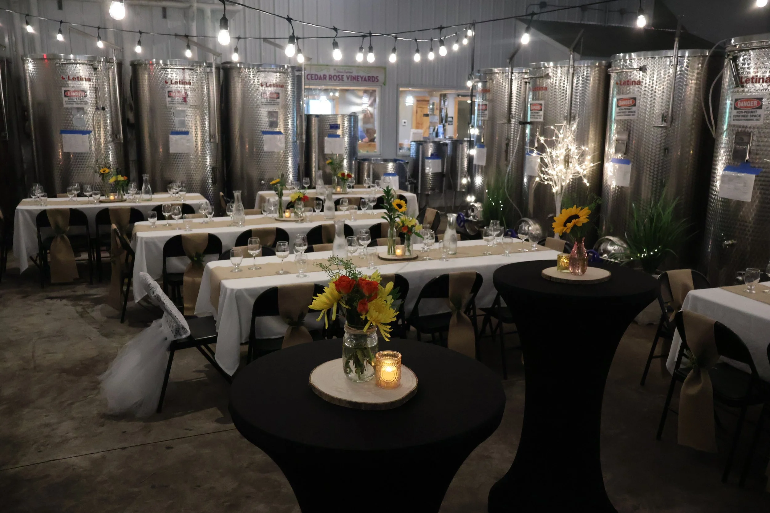 Dine in the Winery Tank Room, in the Loft, or on our Porch—featuring open-air views in summer and heated enclosure for cozy winter events.